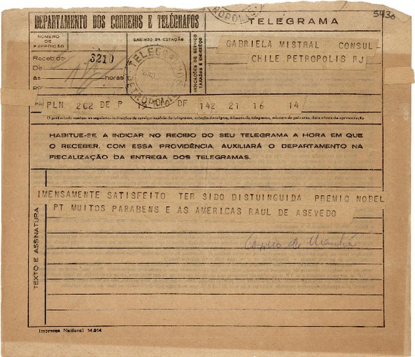 Mistral, Gabriela - Azevedo, Raúl de - Manuscritos brasileños - Autores brasileños - Correspondencia
