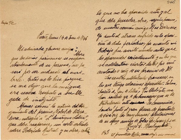 [Carta] 1946 ago. 1, Montevideo, Uruguay [a] Joaquín Edwards Bello [manuscrito] Hugo D. Barbagelata.