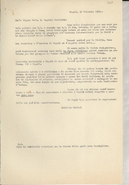 [Carta] 1952 febbr. 17, Napoli, [Italia] [a] Eugenio Coselschi [manuscrito] Gabriela Mistral.