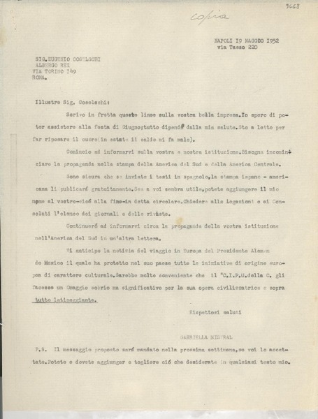[Carta] 1952 magg. 19, Napoli, [Italia] [a] Eugenio Coselschi, Roma, [Italia] [manuscrito] Gabriella [i.e. Gabriela] Mistral.