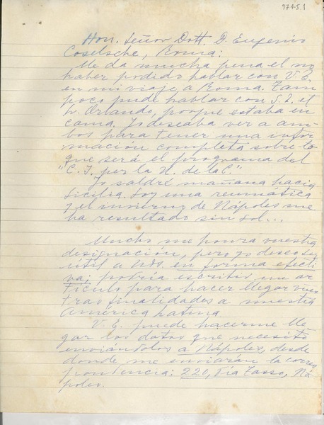 [Carta] Nápoles, [Italia] [a] Eugenio Coselschi, Roma, [Italia] [manuscrito] [Gabriela Mistral].