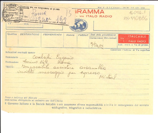 [Carta] 1952 magg. 13, Roma, [Italia] [a] Gabriela Mistral, Napoli [manuscrito] Eugenio Coselschi.