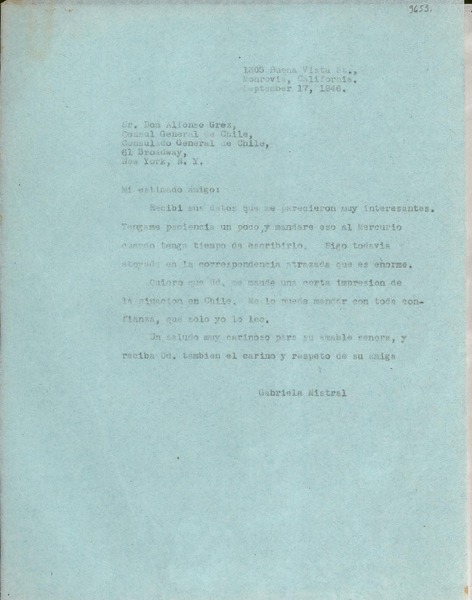 [Carta] 1946 sept. 17, Monrovia, California [a] Alfonso Grez, New York [manuscrito] Gabriela Mistral.