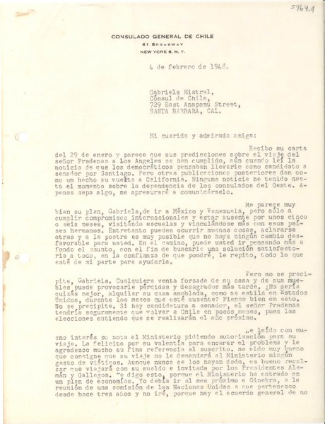 [Carta] 1948 feb. 4, New York, [Estados Unidos] [a] Gabriela Mistral, Santa Bárbara, Cal[ifornia], [Estados Unidos] [manuscrito] Alfonso Grez.