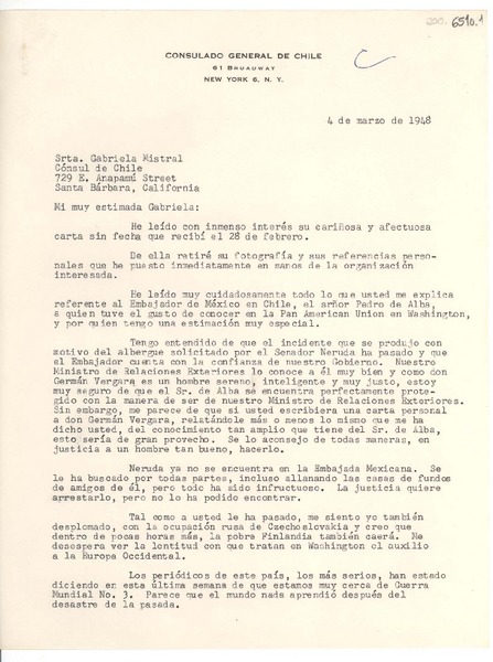 [Carta] 1948 mar. 4, New York [a] Gabriela Mistral, Santa Bárbara, California [manuscrito] Alfonso Grez.