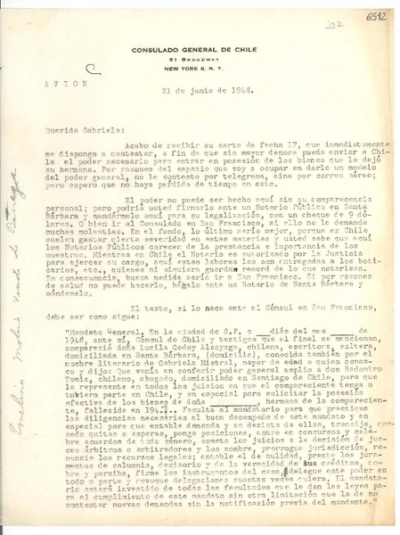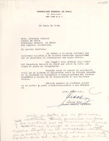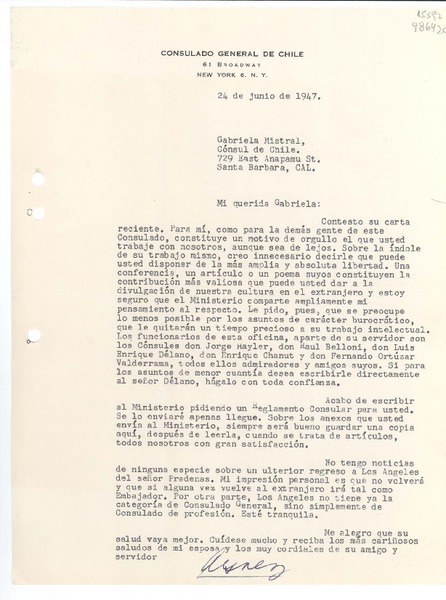 [Carta] 1947 jun. 24, Consulado General de Chile, 61 Broadway, New York 6, N. Y., [EE.UU.] [a] Gabriela Mistral, Cónsul de Chile, 729 East Anapamu St., Santa Barbara, Cal., [EE.UU.] [manuscrito] Alfonso Grez.