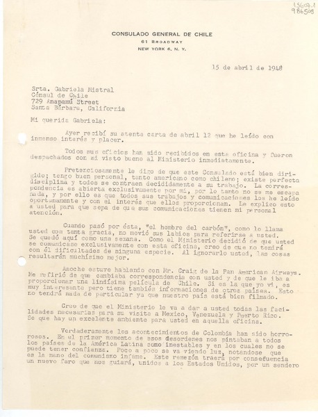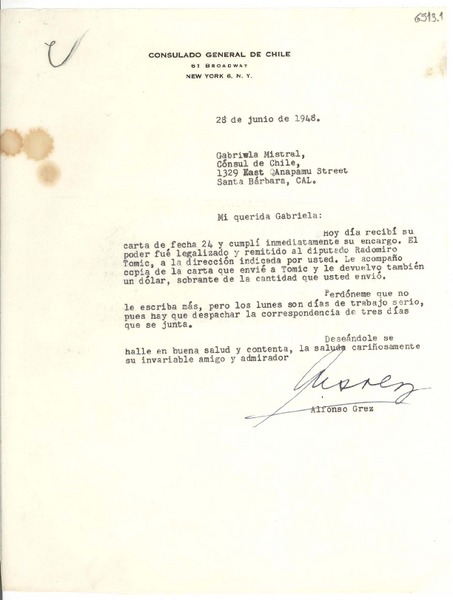 [Carta] 1948 abr. 26, Consulado General de Chile, 61 Broadway, New York 6, N. Y., [EE.UU.] [a la] Srta. Gabriela Mistral, Cónsul de Chile, 729 Anapamú Street, Santa Bárbara, Clifornia [i.e. California], [EE.UU.] [manuscrito] Alfonso Grez.