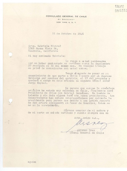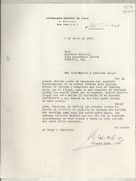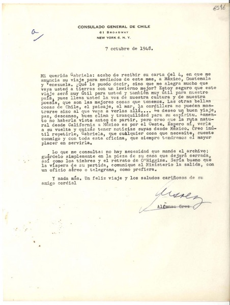 [Carta] 1948 abr. 16, Consulado General de Chile, 61 Broadway, New York 6, N. Y., [EE.UU.] [a la] Srta. Gabriela Mistral, Cónsul de Chile, 729 Anapamú Street, Santa Bárbara, California, [EE.UU.] [manuscrito] Alfonso Grez.