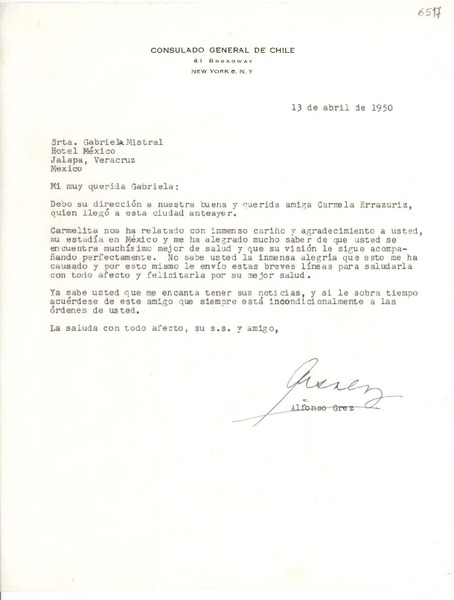 [Carta] 1950 abr. 13, New York [a] Gabriela Mistral, Jalapa, Veracruz, México [manuscrito] Alfonso Grez.