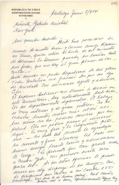 [Carta] 1954 jun. 8, Santiago [a] Gabriela Mistral, New York [manuscrito] Alfonso Grez.