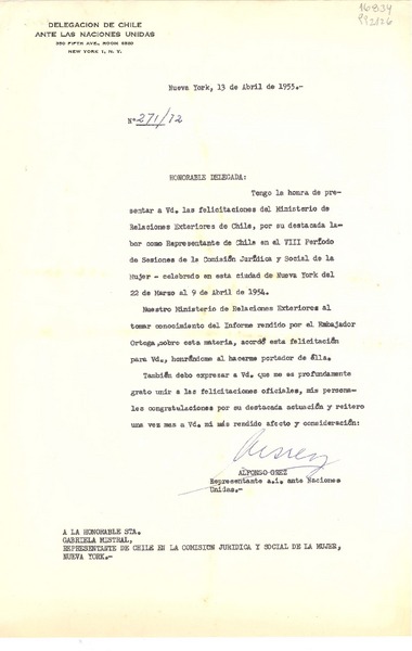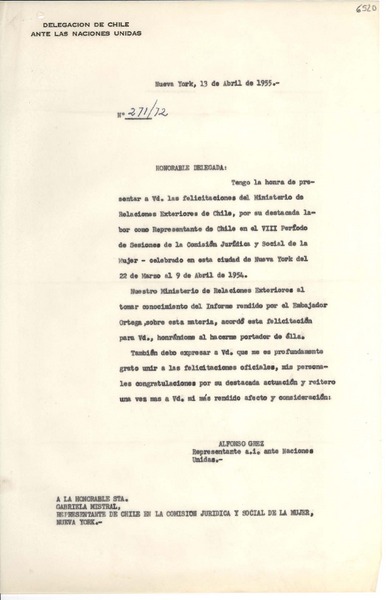 [Carta] 1955 abr. 13, Nueva York, [EE.UU.] [a la] Honorable Sta. Gabriela Mistral, representante de Chile en la Comisión Jurídica y Social de la Mujer, Nueva York, [EE.UU.] [manuscrito] Alfonso Grez, Representante a.i. ante las Naciones Unidas.