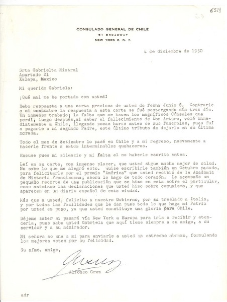 [Carta] 1950 dic. 4, New York [a] Gabriela Mistral, Xalapa, México [manuscrito] Alfonso Grez.