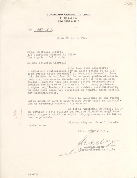 [Carta] 1946 mar. 19, New York, [Estados Unidos] [a] Gabriela Mistral, Los Angeles, California [manuscrito] Alfonso Grez.