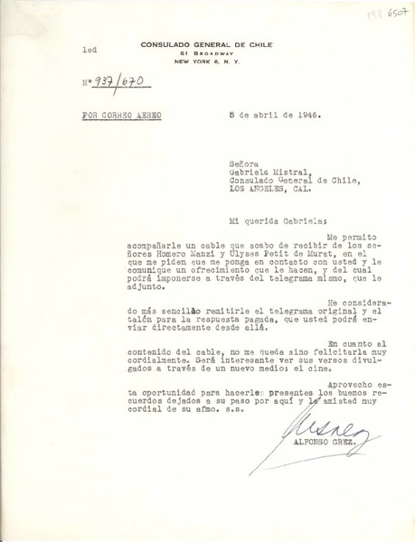 [Carta] 1946 abr. 5, New York, [Estados Unidos] [a] Gabriela Mistral, Los Angeles, Calif[ornia] [manuscrito] Alfonso Grez.