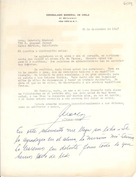 [Carta] 1947 dic. 29, New York, [Estados Unidos] [a] Gabriela Mistral, Santa Bárbara, California [manuscrito] Alfonso Grez.