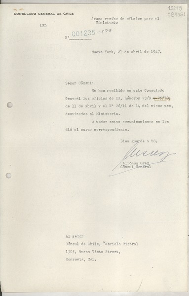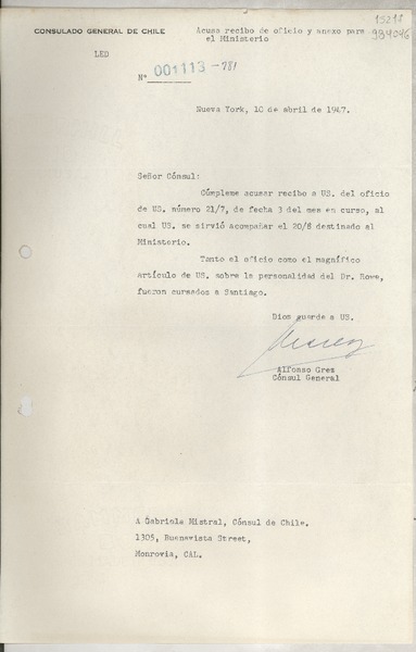 [Carta] 1947 abr. 21, New York, [Estados Unidos] [al] señor Cónsul de Chile, Gabriela Mistral, 1305 Buenavista Street, Monrovia, Cal. [manuscrito] Alfonso Grez.