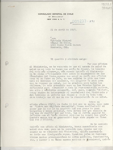 [Carta] 1948 abr. 15, Consulado General de Chile, 61 Broadway, New York 6, N. Y., [EE.UU.] [a la] Srta. Gabriela Mistral, Cónsul de Chile, 729 Anapamú Street, Santa Bárbara, California, [EE.UU.] [manuscrito] Alfonso Grez.