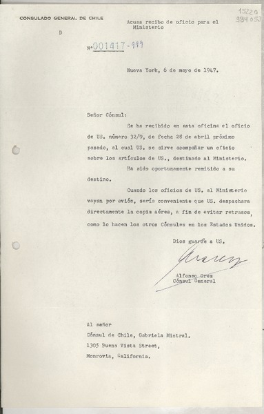 [Carta] 1947 mayo 6, New York, [Estados Unidos] [al] señor Cónsul de Chile, Gabriela Mistral, 1305 Buenavista Street, Monrovia, Cal. [manuscrito] Alfonso Grez.