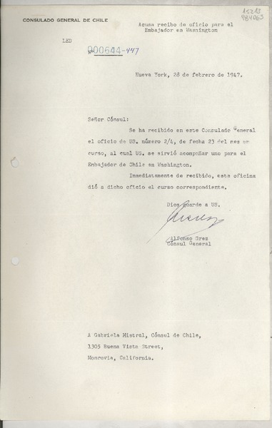 [Oficio] N° 000644-447, 1947 feb. 28, Nueva York, [EE.UU.] [a] Gabriela Mistral, Cónsul de Chile, 1305 Buena Vista Street, Monrovia, California, [EE.UU.] [manuscrito] Alfonso Grez Cónsul General.