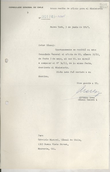 [Carta] 1947 jun. 3, New York, [Estados Unidos] [a] Gabriela Mistral, Cónsul de Chile, 1305 Buenavista Street, Monrovia, Cal. [manuscrito] Alfonso Grez.