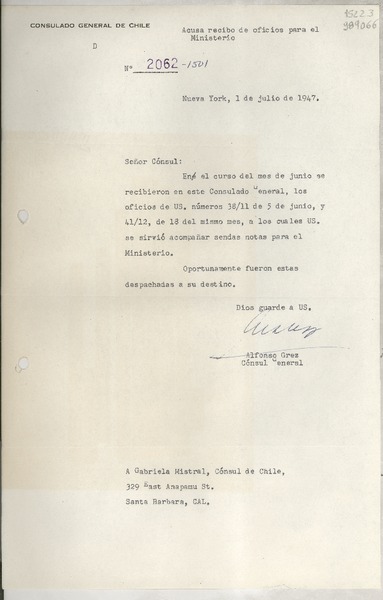 [Carta] 1947 jul. 1, New York, [Estados Unidos] [a] Gabriela Mistral, Cónsul de Chile, 329 East Anapamu St., Santa Barbara, Cal. [manuscrito] Alfonso Grez.