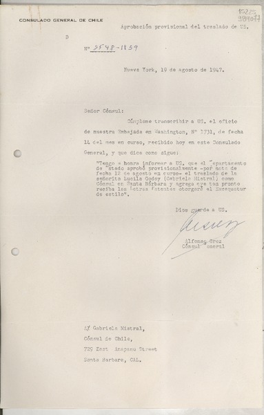 [Carta] 1947 ago. 19, New York, [Estados Unidos] [a] Gabriela Mistral, Cónsul de Chile, 729 East Anapamu Street., Santa Barbara, Cal. [manuscrito] Alfonso Grez.