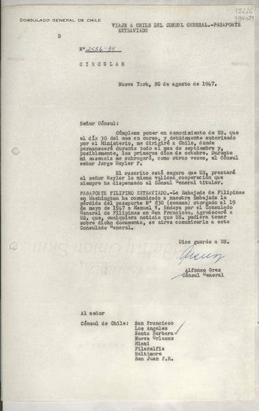 Circular N° 2556-34, 1947 ago. 20, New York, [Estados Unidos] [al] señor Cónsul de Chile, Santa Barbara [manuscrito] Alfonso Grez.