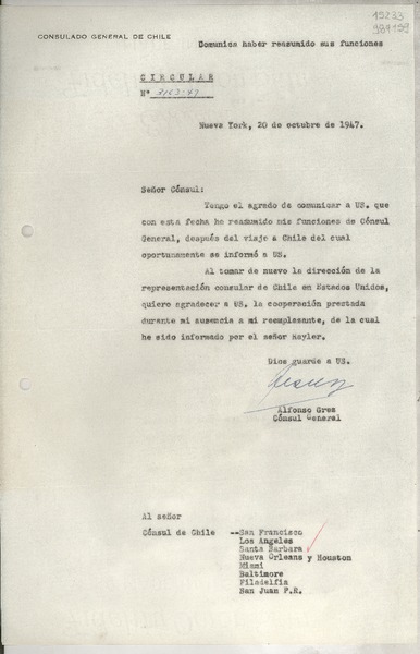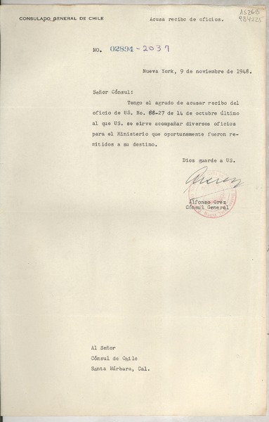 Circular N° 02894-2037, 1948 nov. 9, Nueva York, [EE.UU.] [al] Señor Cónsul de Chile, Santa Bárbara, Cal., [EE.UU.] [manuscrito] Alfonso Grez Cónsul General.