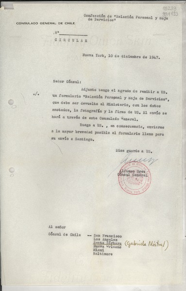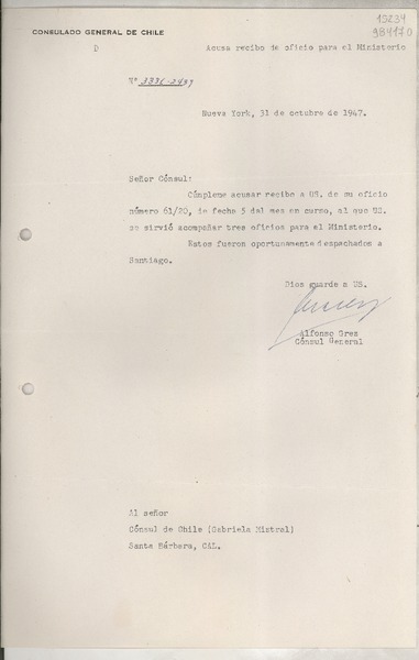 [Circular] N° 3336-2439, 1947 oct. 31, Nueva York, [Estados Unidos] [al] señor Cónsul de Chile (Gabriela Mistral), Santa Barbara, Cal. [manuscrito] Alfonso Grez.