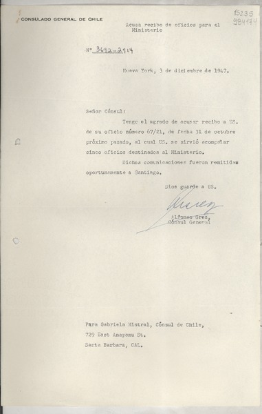 [Circular] N° 3692-2714, 1947 dic. 3, Nueva York, [Estados Unidos] [a] Gabriela Mistral, Cónsul de Chile, 729 East Anapamu St., Santa Barbara, Cal. [manuscrito] Alfonso Grez.