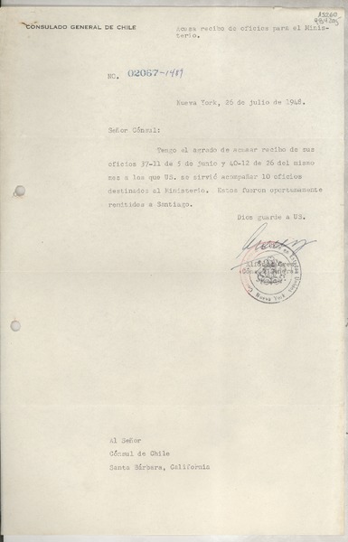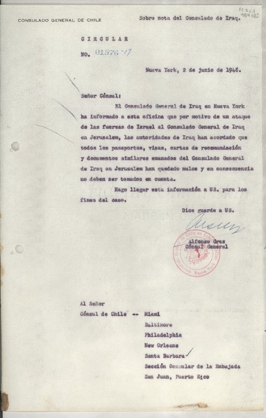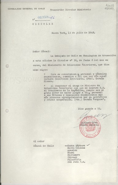 Circular N° 02067-1489, 1948 jul. 26, Nueva York, [EE.UU.] [al] Señor Cónsul de Chile, Santa Bárbara, California, [EE.UU.] [manuscrito] Alfonso Grez Cónsul General.