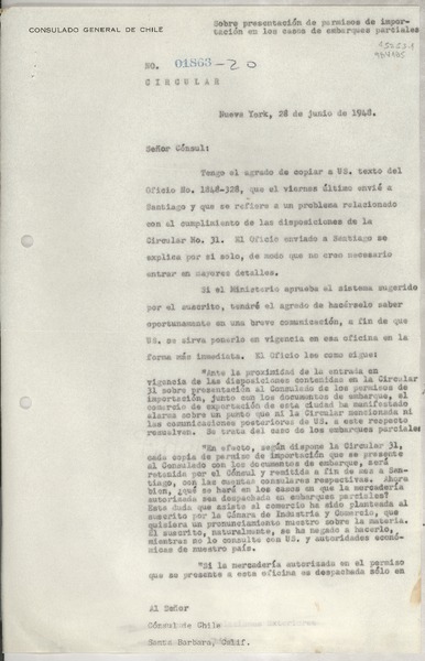Circular N° 01863-20, 1948 jun. 28, Nueva York, [EE.UU.] [al] Señor Cónsul de Chile, Santa Bárbara, Calif., [EE.UU.] [manuscrito] Alfonso Grez Cónsul General.