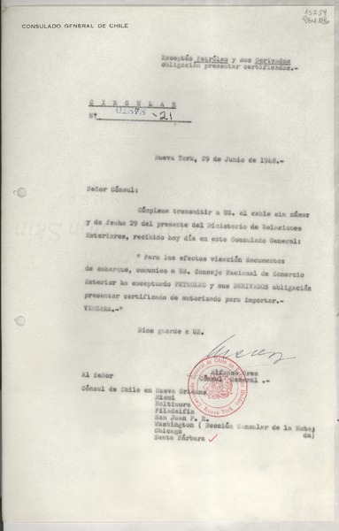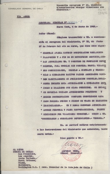 [Circular] N° 00811-512, 1948 mar. 20, Nueva York, [Estados Unidos] [al] señor Cónsul de Chile, Santa Bárbara, California [manuscrito] Alfonso Grez.