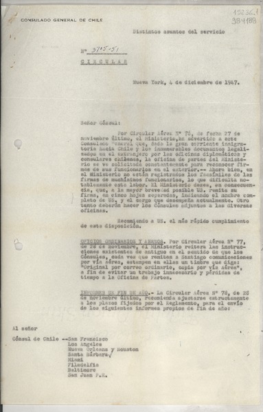 Circular N° 3705-51, 1947 dic. 4, Nueva York, [Estados Unidos] [al] señor Cónsul de Chile, Santa Barbara [manuscrito] Alfonso Grez.