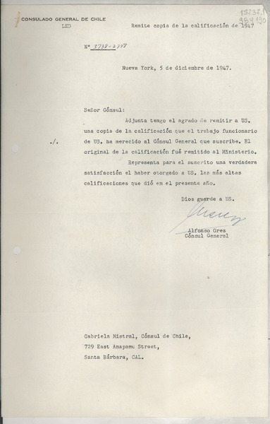 [Circular] N° 3738-2748, 1947 dic. 5, Nueva York, [Estados Unidos] [a] Gabriela Mistral, Cónsul de Chile, 729 East Anapamu Street., Santa Bárbara, Cal. [manuscrito] Alfonso Grez.
