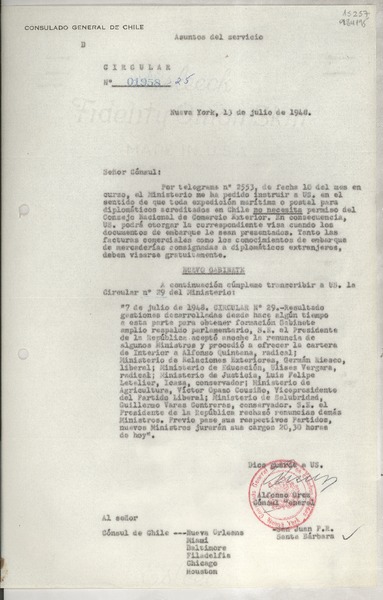 Circular N° 01958-25, 1948 jul. 13, Nueva York, [EE.UU.] [a los] [Señores Cónsules de Chile en EE.UU. y Puerto Rico] [manuscrito] Alfonso Grez Cónsul General.