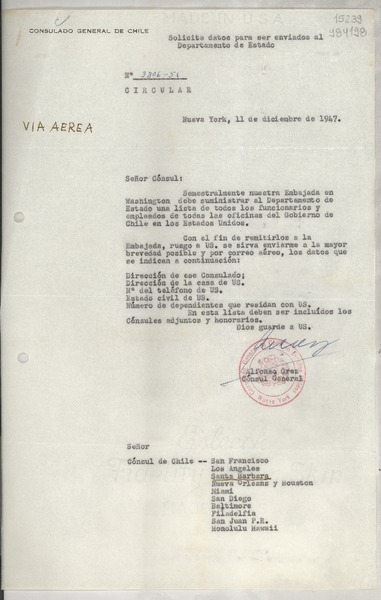 Circular, 1947 dic. 10, Nueva York, [Estados Unidos] [al] señor Cónsul de Chile, Santa Bárbara [manuscrito] Alfonso Grez.