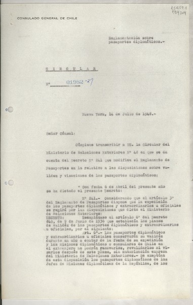 Circular N° 01920-23, 1948 jul. 7, Nueva York, [EE.UU.] [a los] [Señores Cónsules de Chile en EE.UU. y Puerto Rico] [manuscrito] Alfonso Grez Cónsul General.