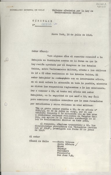 Circular N° 02153-30, 1948 jul. 30, Nueva York, [EE.UU.] [a los] [Señores Cónsules de Chile en EE.UU. y Puerto Rico] [manuscrito] Alfonso Grez Cónsul General.