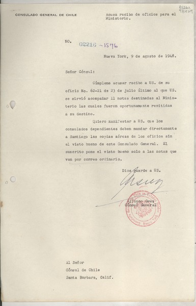 Circular N° 02216-1576, 1948 ago. 9, Nueva York, [EE.UU.] [al] Señor Cónsul de Chile, Santa Bárbara, Calif., [EE.UU.] [manuscrito] Alfonso Grez Cónsul General.