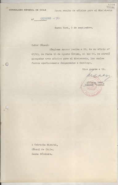 [Circular] N° 02400-1713, [1948] sept. 2, Nueva York, [EE.UU.] [a] Gabriela Mistral, Cónsul de Chile, Santa Bárbara, [EE.UU.] [manuscrito] Alfonso Grez Cónsul General.
