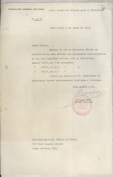 [Circular] N° 13-2, 1948 ene. 2, Nueva York, [Estados Unidos] [a] Gabriela Mistral, Cónsul de Chile, 729 East Anapamu Street., Santa Bárbara, Cal. [manuscrito] Alfonso Grez.