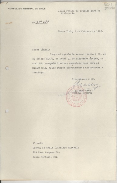 [Circular] N° 354-233, 1948 feb. 3, Nueva York, [Estados Unidos] [al] señor Cónsul de Chile (Gabriela Mistral), 729 East Anapamu St., Santa Barbara, Cal. [manuscrito] Alfonso Grez.