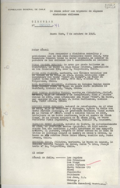 Circular N° 02657-41, 1948 oct. 7, Nueva York, [EE.UU.] [a los] [Señores Cónsules de Chile en EE.UU. y Puerto Rico] [manuscrito] Alfonso Grez Cónsul General.
