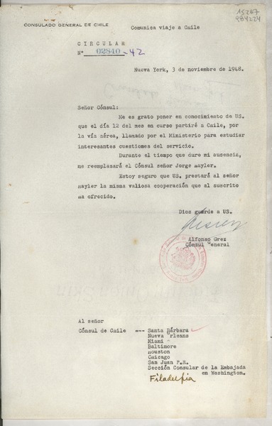 Circular N° 02840-42, 1948 nov. 3, Nueva York, [EE.UU.] [a los] [Señores Cónsules de Chile en EE.UU. y Puerto Rico] [manuscrito] Alfonso Grez Cónsul General.