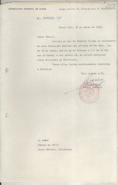[Circular] N° 00819-514, 1948 mar. 22, Nueva York, [Estados Unidos] [al] señor Cónsul de Chile, Santa Bárbara, California [manuscrito] Alfonso Grez.