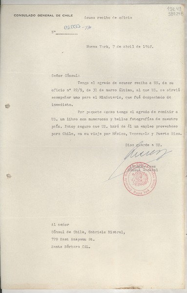 [Circular] N° 01035-130, 1948 abr. 7, Nueva York, [Estados Unidos] [al] señor Cónsul de Chile, Gabriela Mistral, 729 East Anapamu Street, Santa Bárbara, Cal. [manuscrito] Alfonso Grez.