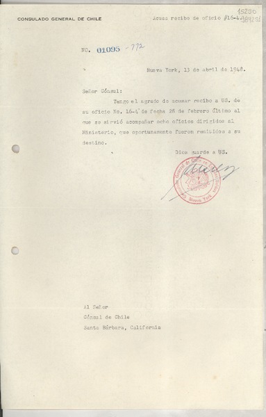 [Circular] N° 01095-112, 1948 abr. 13, Nueva York, [Estados Unidos] [al] señor Cónsul de Chile, Santa Bárbara, California [manuscrito] Alfonso Grez.
