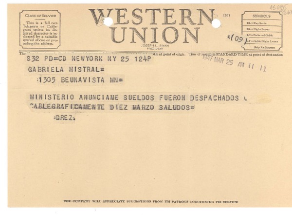 [Telegrama] 1947 mar. 25, New York, NY, [EE.UU.] [a] Gabriela Mistral, 1305 Beunavista [i.e. Buena Vista], [EE.UU.] [manuscrito] [Alfonso] Grez.