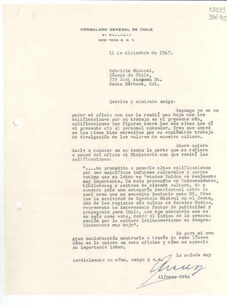 [Carta] 1947 dic. 11, New York, [Estados Unidos] [a] Gabriela Mistral, Cónsul de Chile, Santa Bárbara, Cal. [manuscrito] Alfonso Grez.
